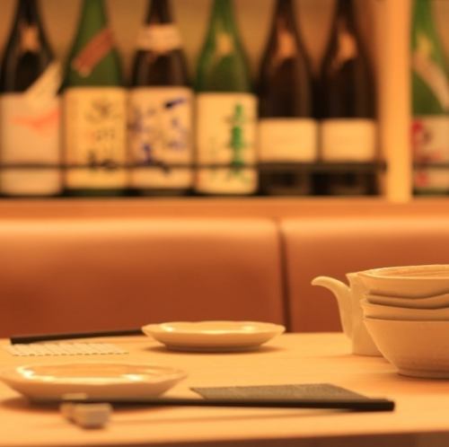 【少人数から大人数まで大歓迎】オープンな席には壁面に飾られた様々な地酒。いろんな地酒を眺めながら、自分好みの地酒を見つけてみてはいかがでしょうか?
